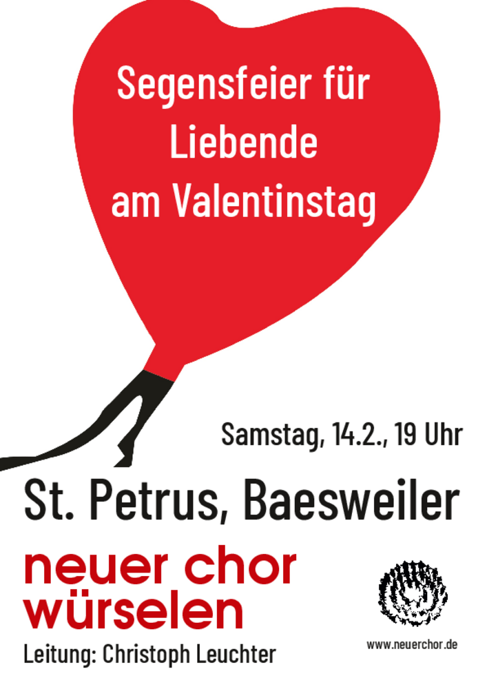 Zum Segensgottesdienst für Liebende lädt die Pfarre St. Marien, Baesweiler, alle sich Liebenden herzlich am 14.02. um 19:00 Uhr nach St. Petrus Baesweiler ein. Jedes Paar kann sich und seine Liebe in dieser Feier segnen lassen. Im Anschluss an den Gottesdienst wird zum Verweilen bei einem Glas Sekt oder Saft eingeladen.